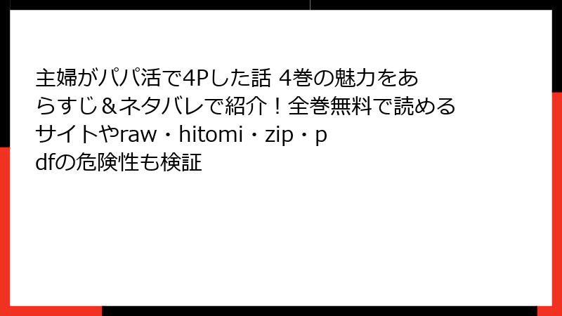 この記事では、人気エッセイ漫画「主婦がパパ活で4Pした話」の第4巻に焦点を当てて、詳細なあらすじをブログ形式でお届けします。作者の体験に基づいたようなリアルで刺激的なストーリーが魅力のこの作品。第4巻では、主人公の冒険がさらに深みを増し、読者を引き込む展開が満載です。以下で、導入からテーマまでを掘り下げて解説していきます。ネタバレを最小限に抑えつつ、読み応えのある内容にまとめました。