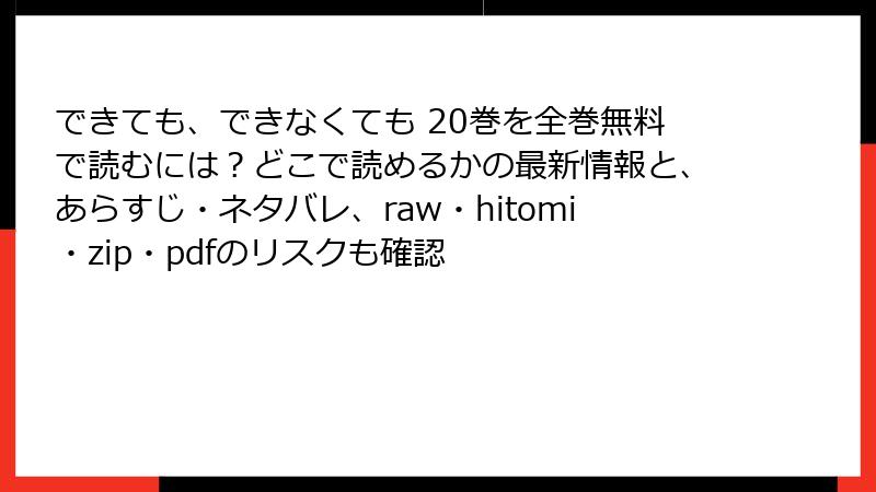 人気恋愛漫画『できても、できなくても』を無料で楽しみたいという誘惑から、raw、hitomi、zip、pdf、漫画バンクなどの海賊版サイトを利用する人がいます。しかし、これらのサイトは違法なコンテンツを扱っており、利用者はさまざまな深刻なリスクにさらされます。この記事では、海賊版サイトの利用がもたらす法的、セキュリティ、プライバシー、詐欺、倫理的な問題を詳しく解説します。安易な利用は避け、正規の手段で作品を楽しむことを強くおすすめします。