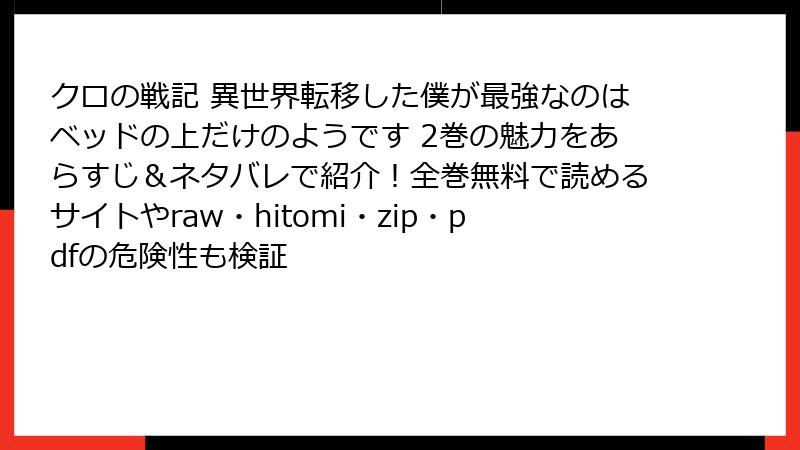 人気の異世界ファンタジー漫画「クロの戦記 異世界転移した僕が最強なのはベッドの上だけのようです」を、raw、hitomi、zip、pdf、漫画バンクなどの海賊版サイトで無料で読もうと考える人もいるかもしれません。しかし、これらのサイトを利用することは、さまざまな深刻なリスクを伴います。この記事では、日本国内の法規制や実際の事例を基に、法的、セキュリティ、倫理的側面から詳しく解説します。海賊版サイトの利用は一時的な便利さ以上の損失を生む可能性が高いので、ぜひ参考にしてください。