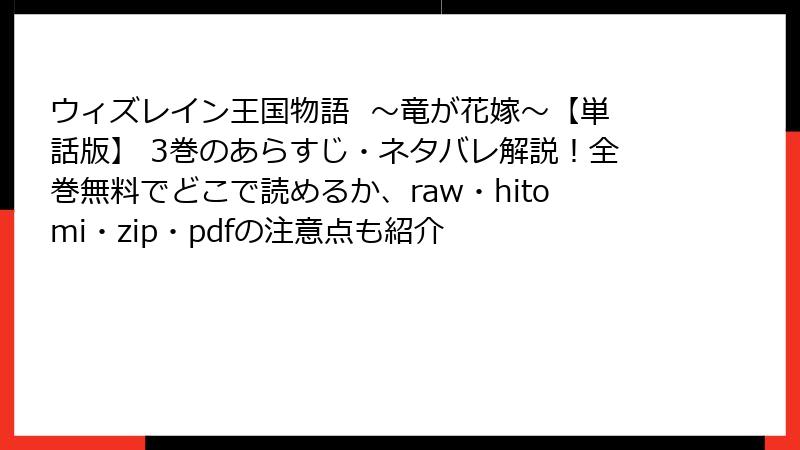 ファンタジー漫画『ウィズレイン王国物語 ~竜が花嫁~【単話版】 3巻』を、raw、hitomi、zip、pdf、漫画バンクなどの海賊版サイトで無料で読もうとする人は少なくありません。しかし、これらのサイトは違法アップロードされたコンテンツを提供しており、利用には深刻なリスクが伴います。この記事では、法的・セキュリティ・プライバシーなどの観点から詳しく解説します。海賊版の利用は一時的な便利さ以上の損失を生む可能性が高いため、絶対に避けましょう。