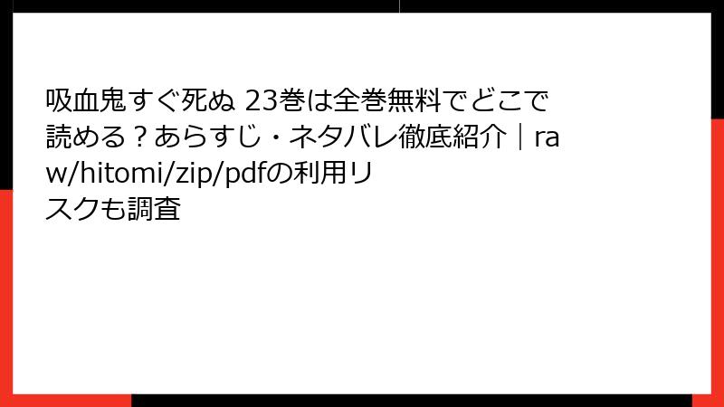人気漫画「吸血鬼すぐ死ぬ」をraw、hitomi、zip、pdf、漫画バンクなどの海賊版サイトで無料で読もうとする人は少なくありません。一見便利に見えますが、これらのサイトを利用することは法的・セキュリティ的な深刻なリスクを伴います。この記事では、そんな海賊版サイトの利用がもたらすさまざまな危険性を詳しく解説します。漫画を楽しむなら、合法的な手段を選ぶことが重要です。