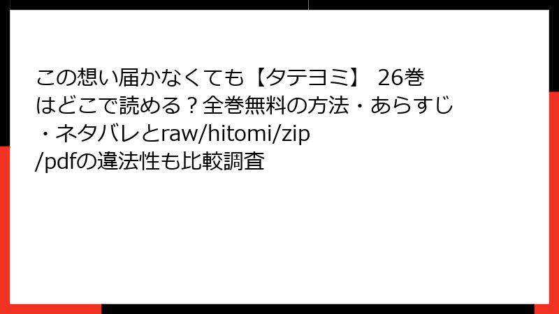海賊版利用は、作者や出版社の収入を奪い、業界全体を衰退させる倫理的問題を引き起こします。「この想い届かなくても【タテヨミ】」のような作品が継続されなくなる可能性もあります。また、社会的に非難される行為です。代わりに、正規の電子書籍サイトを利用しましょう。クーポンや無料試し読みを活用すれば、安全に楽しめます。