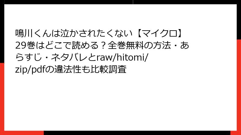 「鳴川くんは泣かされたくない【マイクロ】 29巻」を海賊版サイトで読むのは、法的・セキュリティ・倫理的な観点から見ておすすめできません。無料の裏側に潜む危険を理解し、公式で楽しむのがベストです。海賊版は一時的な満足を与えるかもしれませんが、長期的な損失が大きい。皆さんが安全に漫画ライフを送れることを願っています。
