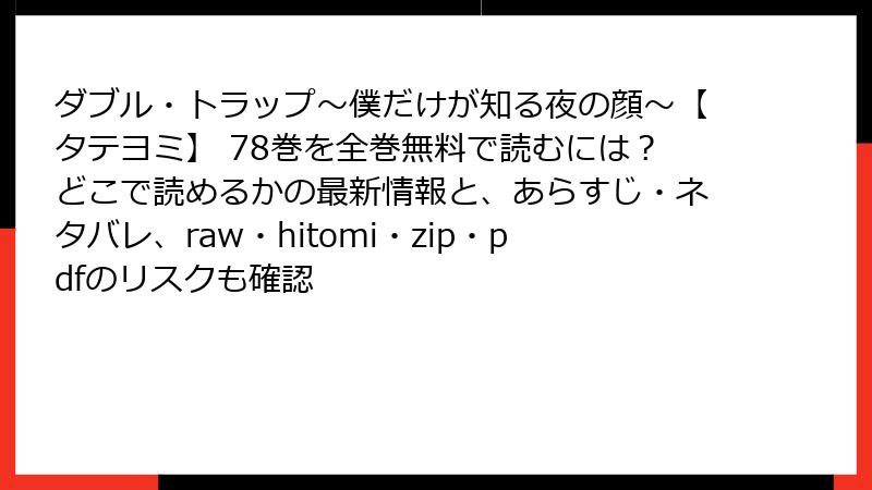 この記事では、BLマンガ「ダブル・トラップ〜僕だけが知る夜の顔〜【タテヨミ】」をraw、hitomi、zip、pdf、漫画バンクなどの海賊版サイトで読むことのリスクを詳しく解説します。無料で読めるように見えるこれらのサイトですが、実際には深刻な危険が伴います。法的・セキュリティ・倫理的な観点から、なぜ避けるべきかをブログ形式で深掘りします。未読の方は正規ルートをおすすめします。