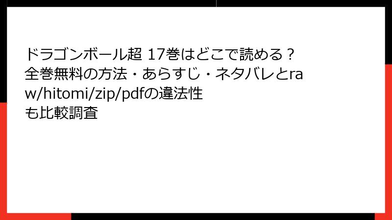「ドラゴンボール超 第17巻」は、人気シリーズの最新展開を楽しめる魅力的なコミックですが、海賊版サイト(raw、hitomi、zip、pdf、漫画バンクなど)で無料で読もうとする行為は、さまざまな深刻なリスクを伴います。これらのサイトは著作権を無視した違法アップロードが横行しており、利用者は法的・セキュリティ・プライバシー面で大きな危険にさらされます。本記事では、これらのリスクを詳しく解説し、なぜ避けるべきかを読み応えのある形でまとめます。安全に楽しむための意識を高めましょう。