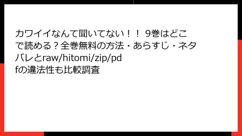 海賊版サイトで「カワイイなんて聞いてない!!」を読むのは、法的・セキュリティ・倫理的な多大なリスクを伴います。これらの問題を避けるため、正規のプラットフォームを利用し、作者を支援する姿勢が重要です。リスクを理解し、健全な楽しみ方を選択することで、長期的に漫画文化を守れます。海賊版の誘惑に負けず、賢い選択を心がけましょう。