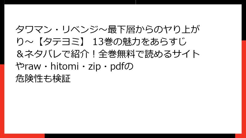 この記事では、人気タテヨミ漫画『タワマン・リベンジ~最下層からのヤり上がり~【タテヨミ】』を、raw/hitomi/zip/pdf/漫画バンクなどの海賊版サイトで読むことのリスクを徹底的に解説します。海賊版サイトは一見無料で便利に見えますが、さまざまな危険が潜んでいます。法的問題からセキュリティの脅威、倫理的な側面まで、詳しく掘り下げます。この漫画のような人気作は公式配信で楽しむのがベストですが、ここではリスクを理解するための情報をまとめます。