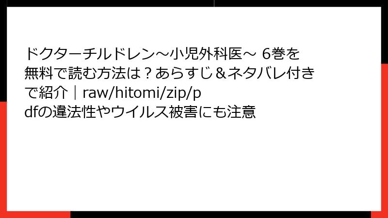 人気の医療漫画「ドクターチルドレン~小児外科医~」を、raw、hitomi、zip、pdf、漫画バンクなどの海賊版サイトで無料で読もうとする人は少なくありません。しかし、これらのサイトを利用することは、法的・セキュリティ面で深刻な危険を伴います。この記事では、そんな海賊版サイトのリスクを詳しく解説。無料の誘惑に負けず、正しい選択をするための情報をブログ形式でお届けします。読み進めれば、海賊版の利用がどれほど損失を生むかがわかるはずです。