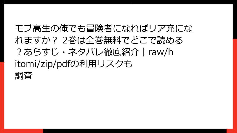 こんにちは、漫画ブロガーです! 今回は『モブ高生の俺でも冒険者になればリア充になれますか?』(通称:モブ冒)2巻のリアルなレビュー・口コミ・評判を徹底収集。電子書籍ストア、SNS、書店レビュー、匿名掲示板まで、良い声も悪い声も全部拾ってきました。2巻発売から1ヶ月で10万部突破の話題作、実際の読者はどう感じているのか? 読み応え抜群の総まとめ、いってみましょう!