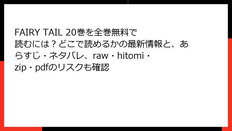 人気漫画『FAIRY TAIL』20巻を、raw/hitomi/zip/pdf/漫画バンクなどの海賊版サイトで読むのは、手軽に思えるかもしれませんが、さまざまなリスクが伴います。これらのサイトは著作権を侵害した違法コンテンツを扱っており、利用者は知らず知らずのうちに問題を抱える可能性があります。ここでは、法的、セキュリティ、経済的、品質面のリスクを詳しく解説します。海賊版利用の代償は大きいので、公式ルートをおすすめします。