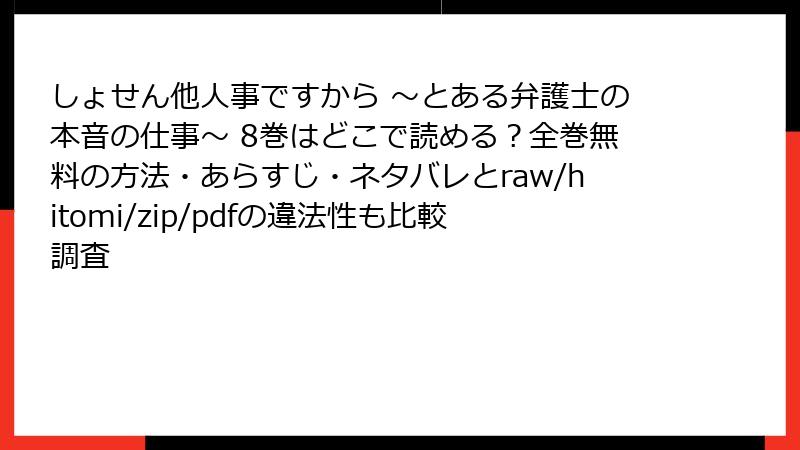 人気の漫画「しょせん他人事ですから ~とある弁護士の本音の仕事~」を、raw、hitomi、zip、pdf、漫画バンクなどの海賊版サイトで読むのは、手軽に見える一方で、深刻なリスクを伴います。この記事では、そうした海賊版利用の危険性を多角的に解説します。法的問題からセキュリティの脅威まで、知っておくべきポイントを詳しく掘り下げ、なぜ正規ルートを選ぶべきかを考えていきましょう。海賊版は一時的な楽しみを提供するかもしれませんが、後悔の種をまく可能性が高いのです。