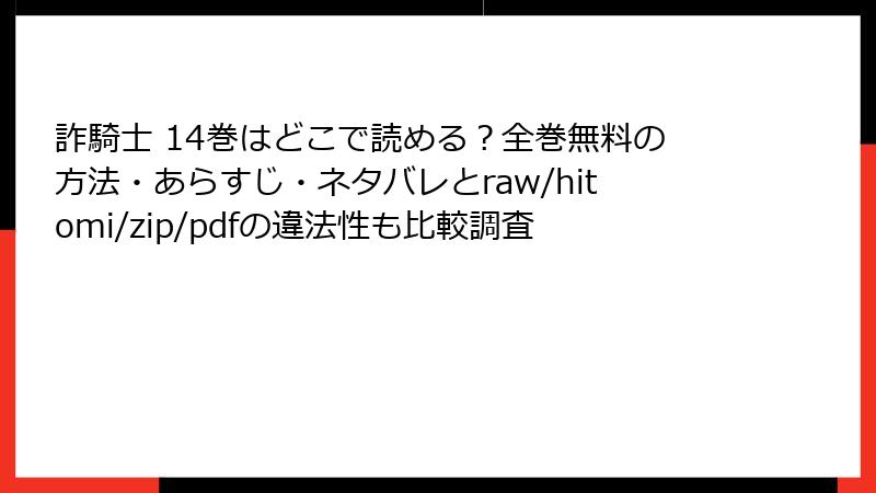 人気コミック「詐騎士」の14巻を、raw、hitomi、zip、pdf、漫画バンクなどの海賊版サイトで無料で読もうとする人は少なくありません。しかし、これらのサイトを利用することは、法的・セキュリティ面で深刻な危険を伴います。この記事では、そんな海賊版サイトのリスクを詳しく解説します。正規ルートで楽しむことを強くおすすめします。