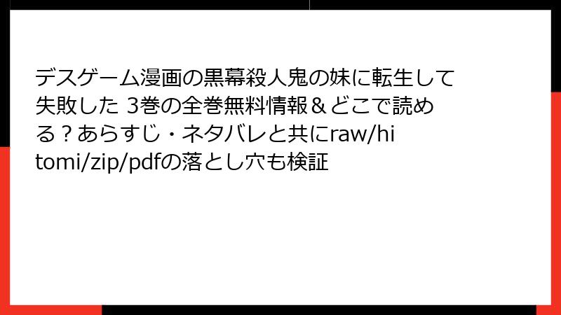 この記事では、人気転生系漫画『デスゲーム漫画の黒幕殺人鬼の妹に転生して失敗した』の第3巻について、詳しいあらすじをブログ形式でまとめていきます。転生ものにデスゲーム要素が絡む独特のストーリーが魅力の作品で、3巻では主人公の舞の努力が新たな展開を迎えます。ネタバレを最小限に抑えつつ、読み応えのある内容でお届けします。