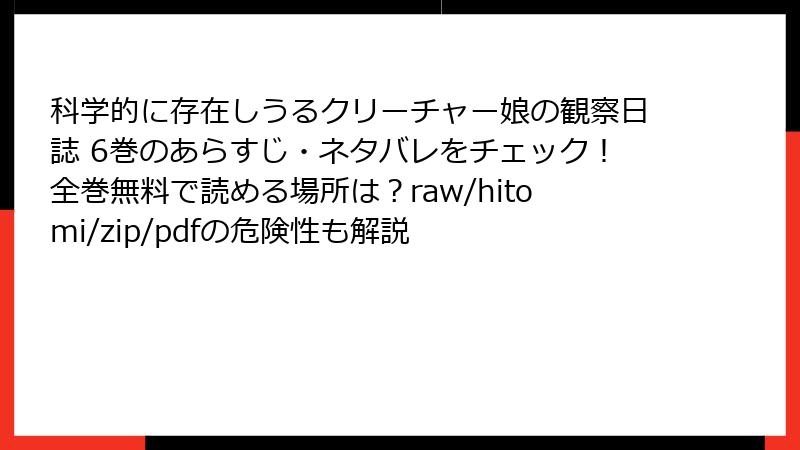 raw、hitomi、zip、pdf、漫画バンクなどの海賊版サイトで「科学的に存在しうるクリーチャー娘の観察日誌 6巻」を読むのは、法的・セキュリティ・経済的・品質・倫理的な多大なリスクを伴います。これらの危険を避けるため、正規の電子書籍サイトや書店を利用しましょう。数百円で安全に楽しめ、作者を応援できる一石二鳥です。海賊版は絶対に避け、正しい方法で漫画ライフを満喫してください。