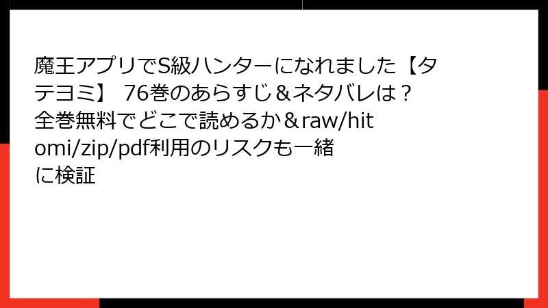 人気のタテヨミ漫画「魔王アプリでS級ハンターになれました【タテヨミ】」を、raw、hitomi、zip、pdf、漫画バンクなどの海賊版サイトで読むことは、手軽に思えるかもしれません。しかし、これらのサイトを利用する行為には深刻なリスクが伴います。以下では、法的な問題からセキュリティ面、倫理的な側面まで、詳しく解説します。合法的なプラットフォームで楽しむことを強くおすすめします。