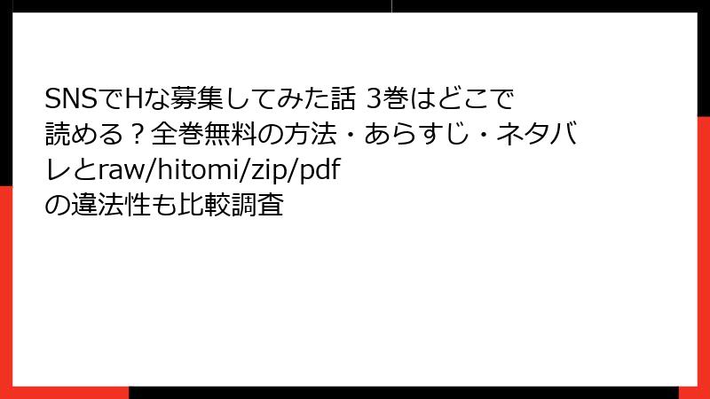 人気コミック「SNSでHな募集してみた話」を無料で楽しみたいと思う人は少なくないでしょう。しかし、raw、hitomi、zip、pdf、漫画バンクなどの海賊版サイトを利用するのは、さまざまな危険を伴います。この記事では、これらのサイトで漫画を読むリスクを法的、セキュリティ、経済的な観点から詳しく解説します。違法行為を避け、安全に楽しむための参考にしてください。