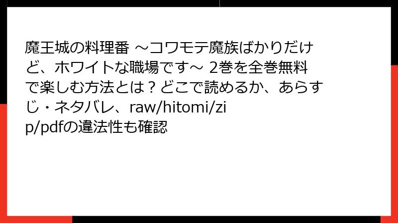 「魔王城の料理番 ~コワモテ魔族ばかりだけど、ホワイトな職場です~」2巻を海賊版サイトで読むのは、法的・セキュリティ・倫理的な観点から非常に危険です。短期的な無料の魅力に惑わされず、長期的な視点で作品を支える選択を。安全で満足度の高い方法で、この魅力的なコミックを楽しんでください。