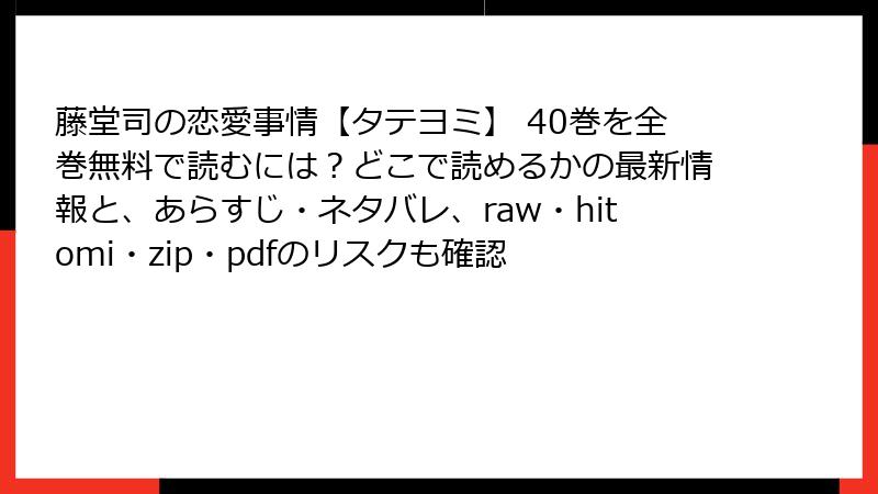 人気のオフィスラブコメ漫画『藤堂司の恋愛事情【タテヨミ】』を無料で楽しみたいと思う気持ちはわかりますが、海賊版サイトを利用するのは避けるべきです。raw、hitomi、zip、pdf、漫画バンクなどの違法サイトは、著作権を侵害したコンテンツを無断でアップロードしており、利用者自身に深刻なリスクが伴います。この記事では、そんな海賊版サイトの危険性を詳しく解説。法的問題からセキュリティ面まで、ブログ風に掘り下げてお伝えします。安全に楽しむ方法を考えるきっかけにしてください。