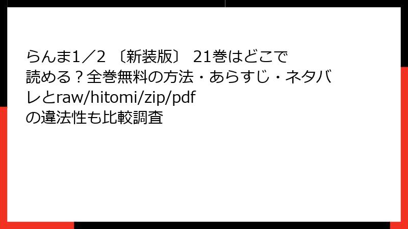 人気漫画「らんま1/2」の新装版21巻を、raw、hitomi、zip、pdf、漫画バンクなどの海賊版サイトで読むのは一見便利に思えますが、さまざまな深刻なリスクが伴います。この記事では、法的問題からセキュリティの脅威、倫理的な側面までを詳しく掘り下げ、なぜ公式ルートを選ぶべきかを考察します。海賊版の利用は一時的な楽しみを提供するかもしれませんが、長期的には自分自身や業界に悪影響を及ぼす可能性が高いのです。