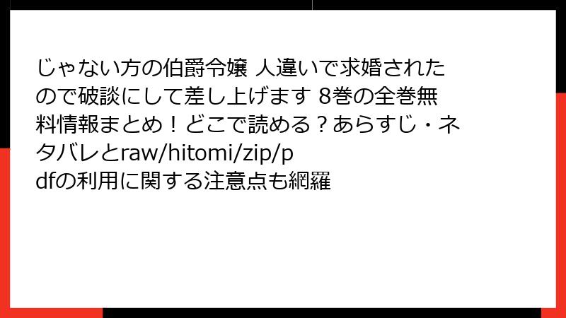 人気漫画「じゃない方の伯爵令嬢 人違いで求婚されたので破談にして差し上げます」8巻を、raw/hitomi/zip/pdf/漫画バンクなどの海賊版サイトで読むのは、手軽に見える一方で深刻なリスクを伴います。この記事では、ブログ形式でそのリスクを詳しく解説します。海賊版の利用は一時的な楽しみのために、長期的な損失を招く可能性が高いです。法的、セキュリティ、倫理的側面から掘り下げてみましょう。