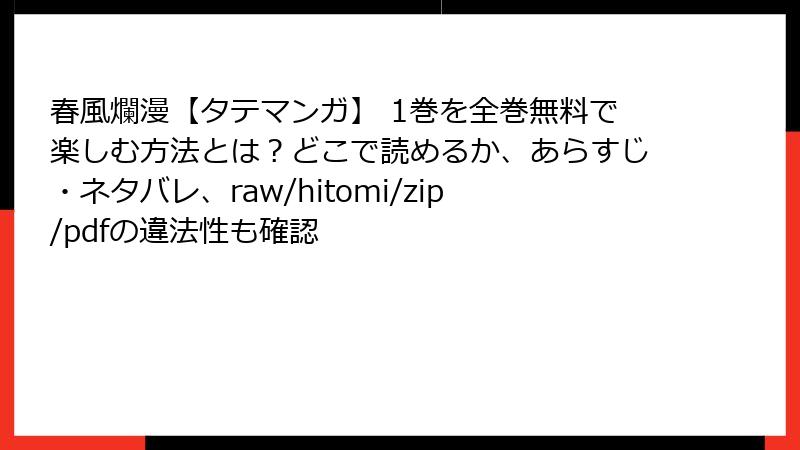 人気のBL作品「春風爛漫【タテマンガ】」1巻を、raw、hitomi、zip、pdf、漫画バンクなどの海賊版サイトで読もうと考える人もいるかもしれません。しかし、これらのサイトを利用することは、さまざまな深刻なリスクを伴います。この記事では、海賊版サイトの利用がもたらす法的、セキュリティ、品質、倫理的、経済的な側面からリスクを詳しく解説します。著作権侵害はクリエイターの権利を損ない、業界全体に悪影響を及ぼすため、合法的な手段で楽しむことを強くおすすめします。以下で、各リスクを深掘りしていきましょう。