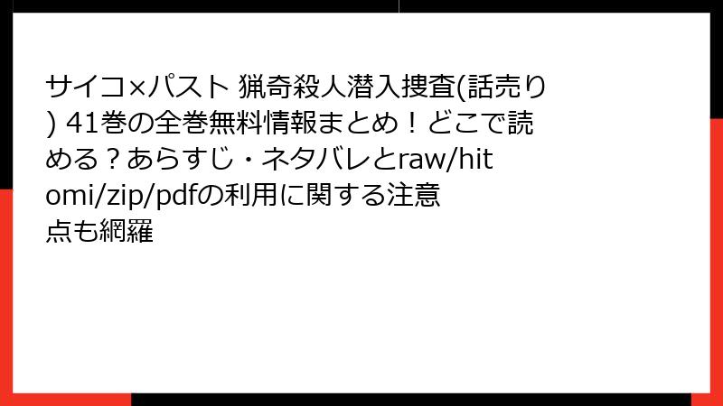 人気のサイコサスペンス漫画『サイコ×パスト 猟奇殺人潜入捜査』を、raw、hitomi、zip、pdf、漫画バンクなどの海賊版サイトで読むのは一見手軽ですが、実は多大なリスクを伴います。本記事では、これらのサイトを利用する際の潜在的な危険をブログ形式で詳しく掘り下げます。法的問題からセキュリティの脅威まで、読み応えのある分析を加え、なぜ正規ルートをおすすめするのかを解説します。海賊版はクリエイターの権利を侵害する行為ですが、ここではリスクに焦点を当ててお伝えします。