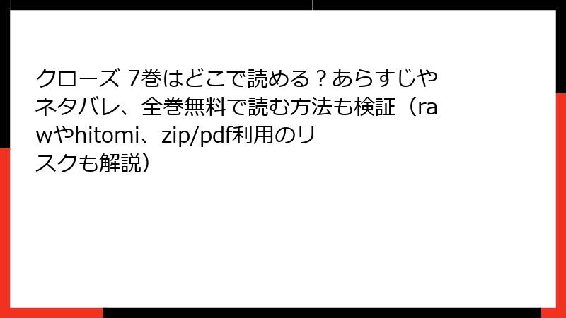 高橋ヒロシの人気漫画『クローズ』7巻を、raw、hitomi、zip、pdf、漫画バンクなどの海賊版サイトで読むことは、一見手軽に思えるかもしれません。しかし、これにはさまざまなリスクが伴います。この記事では、法的、セキュリティ、プライバシー、品質、倫理的な観点から詳しく解説します。海賊版の利用は、作者や業界に悪影響を及ぼすだけでなく、自分自身にも深刻な問題を引き起こす可能性があります。