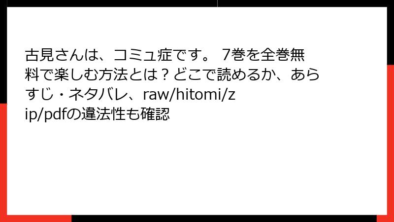 人気漫画「古見さんは、コミュ症です。」を無料で読みたいという誘惑から、raw、hitomi、zip、pdf、漫画バンクなどの海賊版サイトにアクセスする人がいます。しかし、これらのサイトを利用することは、さまざまな深刻なリスクを伴います。この記事では、海賊版サイトの危険性を詳しく解説し、なぜ避けるべきかを読み応えのある形でまとめます。法的・セキュリティ面を中心に、具体例を交えながら説明します。安全に楽しむための選択肢を考えるきっかけになれば幸いです。