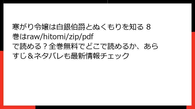 こんにちは、電子書籍マニアのブロガーです! 2025年11月現在、心温まる冬のラブファンタジー『寒がり令嬢は白銀伯爵とぬくもりを知る』が話題沸騰中。寒がり令嬢イロナと白銀伯爵シルヴァのぬくもりあふれる物語は、コミック化されてからさらに魅力倍増! でも、電子書籍で読みたいけど、どのサービスで配信されてるの? という疑問に、今回はズバリお答えします。指定の人気サービス(コミックシーモア、ブックライブ、めちゃコミック、ピッコマ、LINEマンガ、まんが王国、ebookjapan、Renta!)を中心に、最新の配信状況を詳しく調査。無料試し読みの有無や全巻揃い具合もチェックしました。ブログ形式で読みやすくまとめましたので、スマホ片手にサクッと確認を♪ ネタバレなしで、純粋にアクセスガイドとしてお使いください。