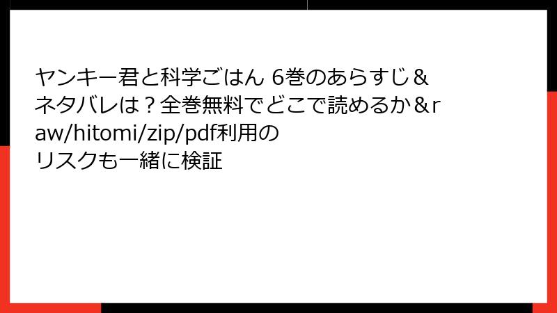人気漫画『ヤンキー君と科学ごはん』をraw、hitomi、zip、pdf、漫画バンクなどの海賊版サイトで無料で読もうと考える人もいるかもしれません。しかし、これらのサイトを利用することは多大な危険を伴います。この記事では、法的・セキュリティ・経済的・倫理的な観点からリスクを詳しく解説します。正規ルートで楽しむことを強くおすすめします。