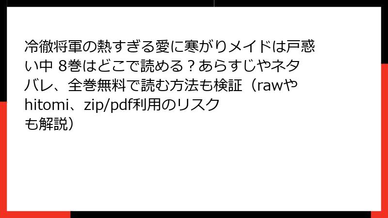 人気のTL漫画『冷徹将軍の熱すぎる愛に寒がりメイドは戸惑い中』第8巻を、raw、hitomi、zip、pdf、漫画バンクなどの海賊版サイトで無料で読もうと考える人もいるかもしれません。しかし、これらのサイトを利用することは深刻なリスクを伴います。この記事では、法的側面からセキュリティ、経済的な被害までを詳しく解説します。違法行為を避け、正規の方法で楽しむことを強くおすすめします。以下で具体的な危険性を掘り下げていきましょう。
