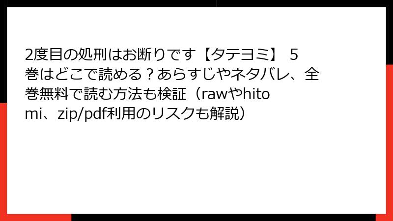 人気漫画「2度目の処刑はお断りです【タテヨミ】」を、raw/hitomi/zip/pdf/漫画バンクなどの海賊版サイトで読むことは、表面上は無料で便利に見えますが、深刻なリスクを伴います。この記事では、そうした海賊版サイト利用の危険性を多角的に解説します。法的問題からセキュリティ面まで、読み応えのある形でまとめています。海賊版利用は避け、正規のプラットフォームで楽しむことを強くおすすめします。