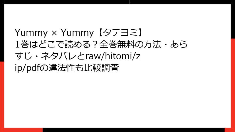 縦読み漫画「Yummy × Yummy【タテヨミ】」は、魅力的なストーリーとビジュアルで人気を集めていますが、海賊版サイト(raw、hitomi、zip、pdf、漫画バンクなど)で無料で読もうとする人が少なくありません。しかし、これらのサイトを利用することは、法的・セキュリティ面で深刻なリスクを伴います。このブログ記事では、そんなリスクを詳しく解説し、なぜ正規ルートを選ぶべきかを読み応えのある形で掘り下げます。安全に楽しむための意識改革をおすすめします。