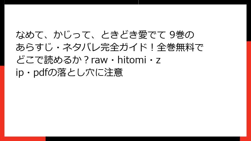 人気ラブコメ漫画「なめて、かじって、ときどき愛でて」を無料で読みたいと思う気持ちはわかりますが、raw、hitomi、zip、pdf、漫画バンクなどの海賊版サイトを利用するのは非常に危険です。これらのサイトは著作権を無視した違法アップロードが多く、利用者が知らずに犯罪に加担する可能性があります。本記事では、そんな海賊版サイトのリスクを法的、セキュリティ、経済的、業界への影響という観点から詳しく解説します。リスクを理解し、合法的な方法で作品を楽しむことを強くおすすめします。