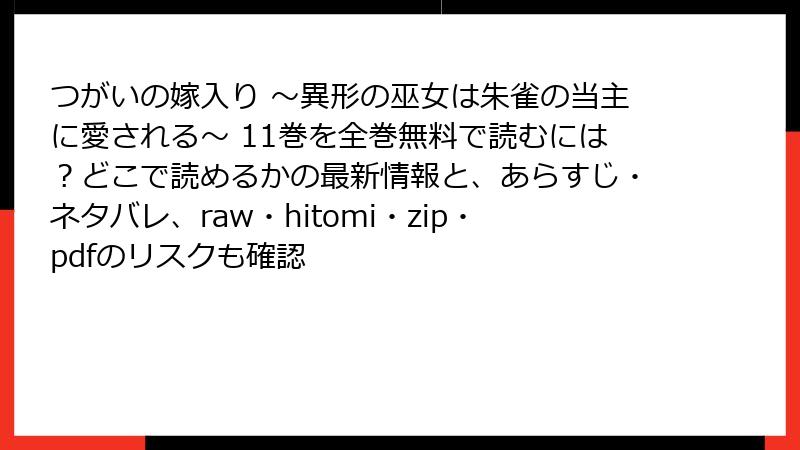 人気の和風ファンタジー漫画「つがいの嫁入り ~異形の巫女は朱雀の当主に愛される~」を、raw、hitomi、zip、pdf、漫画バンクなどの海賊版サイトで読む行為は、表面上は無料で手軽に見えるかもしれません。しかし、これらのサイトを利用することは深刻なリスクを伴います。法的問題からセキュリティの脅威、倫理的な側面まで、さまざまな角度から詳しく解説します。海賊版は作者や出版社の権利を侵害し、業界全体に悪影響を及ぼすため、正規の手段で楽しむことを強くおすすめします。以下では、主なリスクを分類して考察します。