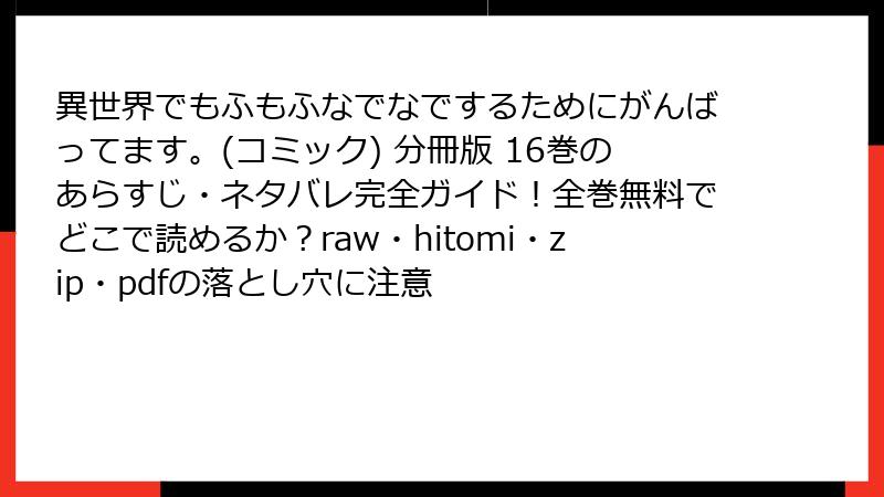 raw、hitomi、zip、pdf、漫画バンクなどの海賊版サイトで「異世界でもふもふなでなでするためにがんばってます。」分冊版16巻を読むのは、法的・セキュリティ・経済的なリスクが大きすぎます。