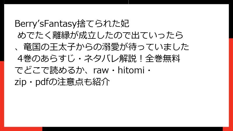 Berry’s Fantasy 「捨てられた妃 めでたく離縁が成立したので出ていったら、竜国王太子からの溺愛が待っていました」4巻をraw/hitomi/zip/pdf/漫画バンクなどの海賊版サイトで読むリスク