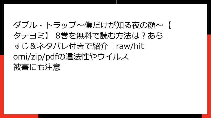 まとめると、海賊版サイトで「ダブル・トラップ〜僕だけが知る夜の顔〜」を読むことは、法的・セキュリティ・倫理的な多重リスクを伴います。短期的な便利さより、持続可能な楽しみ方を考えましょう。この記事が、賢明な判断の一助になれば幸いです。