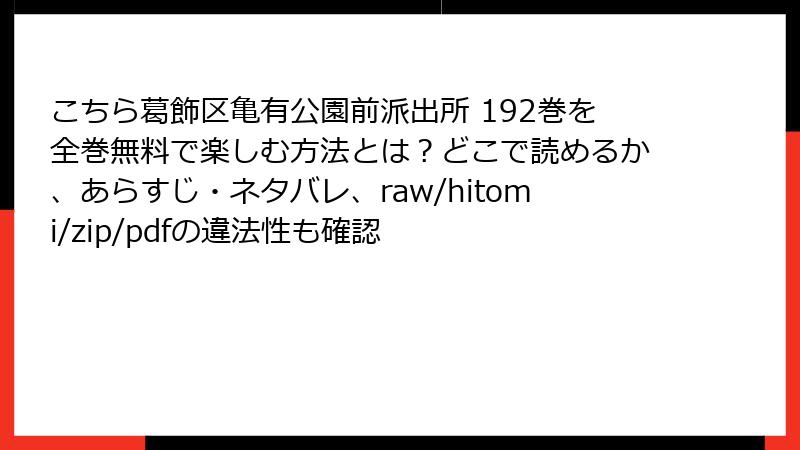 こちら葛飾区亀有公園前派出所 192巻を全巻無料で楽しむ方法とは?どこで読めるか、あらすじ・ネタバレ、raw/hitomi/zip/pdfの違法性も確認