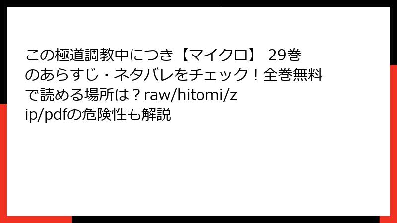夜神里奈先生の人気極道ラブストーリー「この極道調教中につき【マイクロ】」を、raw配信サイト、hitomi、zip圧縮ファイル、pdf形式、漫画バンクなどの海賊版プラットフォームで読もうとするのは、表面的には「無料で読める」という魅力がありますが、実際には法的・セキュリティ・倫理的な重大なリスクが伴います。本記事では、これらのリスクを具体的に分解し、読者が抱える可能性のある被害を詳しく解説します。安全な正規ルートでの楽しみ方を強くおすすめします。