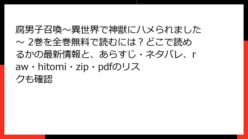 BL漫画ファンの皆さん、こんにちは! 藤咲もえ先生の人気作『腐男子召喚~異世界で神獣にハメられました~』2巻の魅力にハマっている方、きっと多いはず。でも、rawやhitomi、zip、pdf、漫画バンクなどの海賊版サイトで「無料で読める!」と飛びつくのは、絶対にNGです。今回は、そんな海賊版利用のリスクを徹底的に掘り下げます。法的・セキュリティ・プライバシー・倫理的側面から、具体例を交えて解説。無料の裏側に潜むヤバさを、読み応え満載で暴露します。合法ルートで楽しむための参考にどうぞ!
