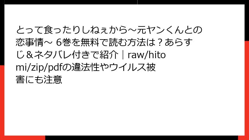 人気漫画『とって食ったりしねぇから~元ヤンくんとの恋事情~』を楽しみたいと思う気持ちはわかりますが、海賊版サイトを利用するのは非常に危険です。raw、hitomi、zip、pdf、漫画バンクなどの違法サイトで読む行為は、法的・セキュリティ面で深刻な問題を引き起こす可能性があります。この記事では、そうしたリスクを詳しく解説し、なぜ避けるべきかを読み応えのある形で掘り下げます。海賊版の利用は一時的な無料の代償として、長期的な損失を招くことを念頭に置いてください。