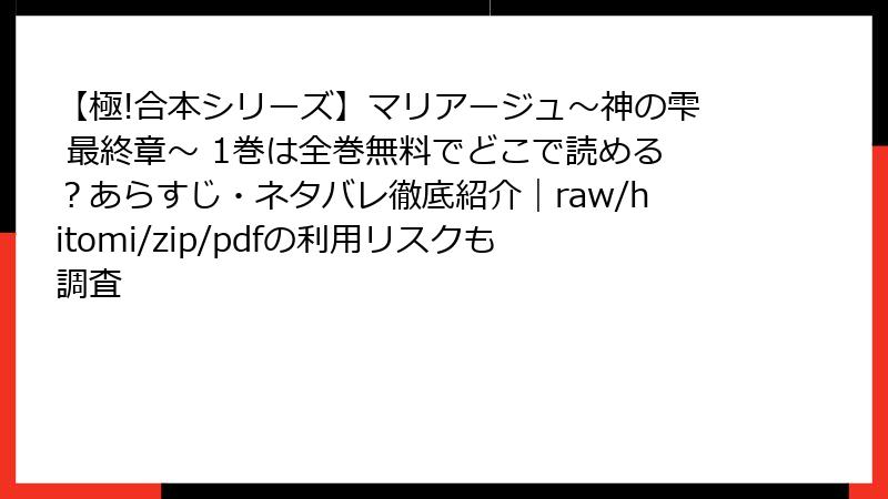人気のワイン漫画「マリアージュ~神の雫 最終章~」の合本シリーズ1巻を、raw、hitomi、zip、pdf、漫画バンクなどの海賊版サイトで読むのは一見無料で手軽に見えますが、深刻なリスクが伴います。この記事では、そんな違法サイト利用の危険性を法的、セキュリティ、プライバシーなどの観点から詳しく解説します。海賊版サイトの利用を検討している方は、ぜひこの内容を参考に、正規の方法で楽しむことをおすすめします。