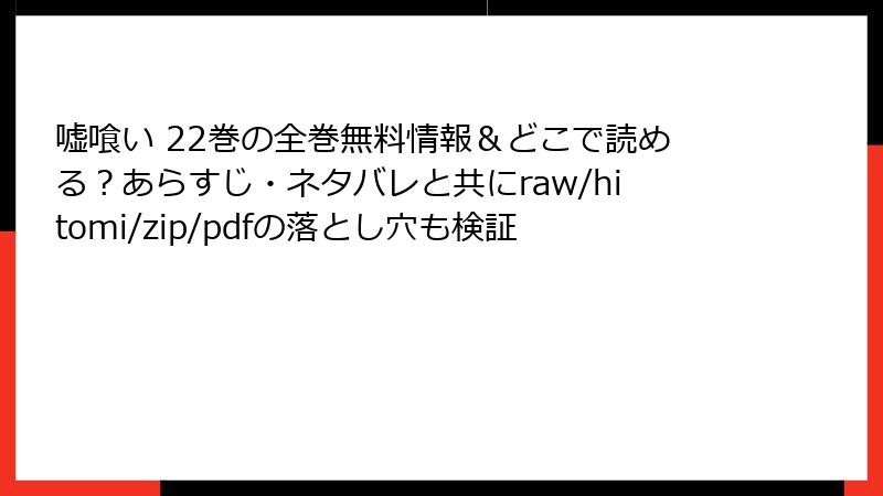 迫稔雄の人気漫画『嘘喰い』22巻を、raw、hitomi、zip、pdf、漫画バンクなどの海賊版サイトで無料で読もうと考える人は少なくないでしょう。しかし、これらのサイトは一見便利に見えますが、深刻なリスクが伴います。この記事では、海賊版サイト利用の危険性を詳しく解説。法的問題からセキュリティ脅威まで、知らずにアクセスすると後悔する可能性が高いので、ぜひ最後まで読んでください。