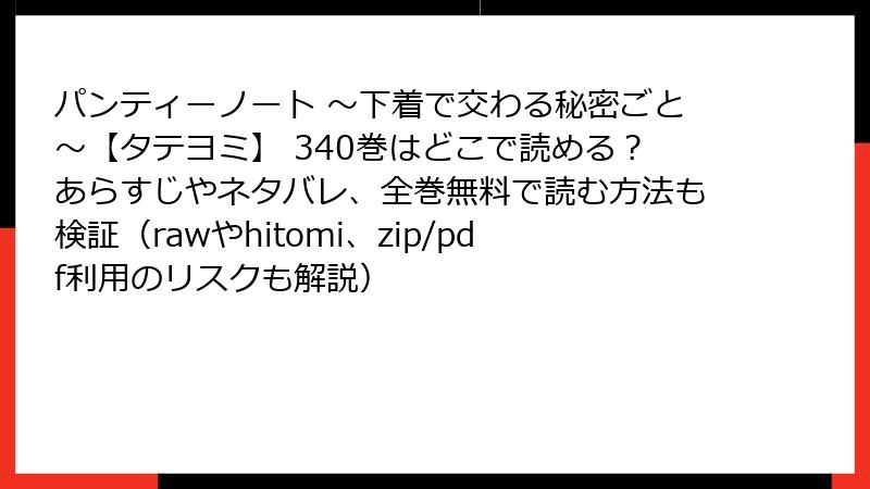 こんにちは、漫画ファンの皆さん! ブログ「マンガ安全読書ラボ」へようこそ。今日は、誰もが一度は気になってしまう『パンティーノート ~下着で交わる秘密ごと~【タテヨミ】』のような魅力的な作品を、raw、hitomi、zip、pdf、漫画バンクなどの海賊版サイトで読むことのリスクについて、深く掘り下げてお話しします。2025年現在、これらのサイトは一見「無料で最新巻が読める!」という甘い誘惑を振りまきますが、実際には法的罰則からデバイス破壊、個人情報漏洩まで、想像以上の危険が潜んでいます。過去の記事であらすじやネタバレを楽しんだ方も、こうしたリスクを知ることで、より安全に漫画の世界を満喫できるはず。複数のセクションに分けて、読み応え満点で解説します。結論から言うと、海賊版は絶対NG! 正規サービスをおすすめします。さあ、警鐘を鳴らしましょう!