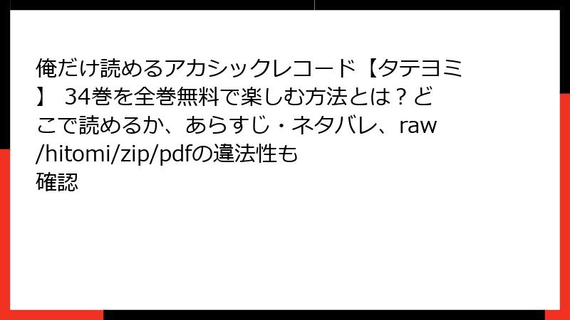 人気のファンタジー漫画「俺だけ読めるアカシックレコード【タテヨミ】」の34巻を、raw、hitomi、zip、pdf、漫画バンクなどの海賊版サイトで無料で読もうとする人は少なくありません。しかし、これらのサイトを利用することは深刻なリスクを伴います。以下で、法的、セキュリティ、品質、倫理的な観点から詳しく解説します。合法的な手段で楽しむことを強くおすすめします。
