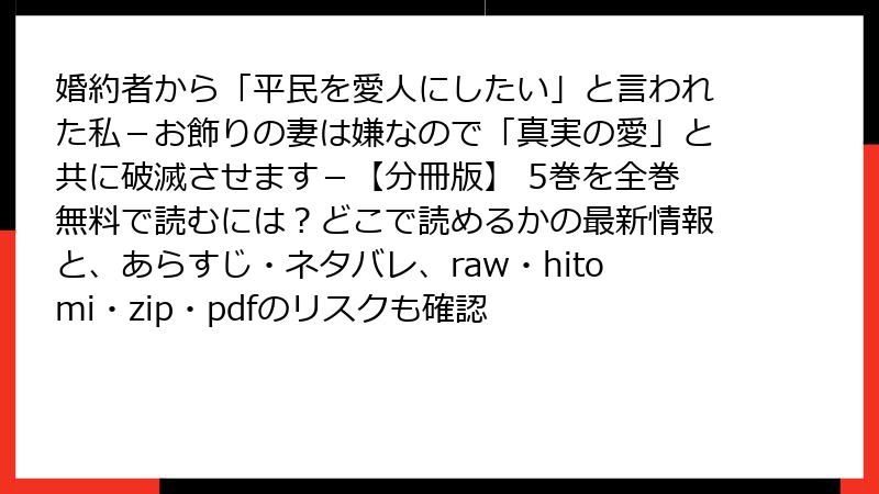 婚約者から「平民を愛人にしたい」と言われた私-お飾りの妻は嫌なので「真実の愛」と共に破滅させます-【分冊版】 5巻を全巻無料で読むには?どこで読めるかの最新情報と、あらすじ・ネタバレ、raw・hitomi・zip・pdfのリスクも確認