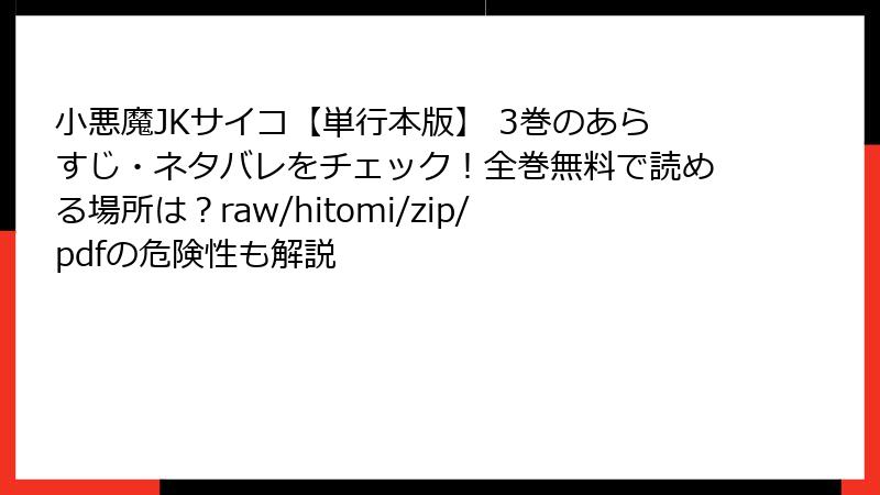 「小悪魔JKサイコ【単行本版】 3巻」は、サイコパスな主人公・葛西心春の高校生時代を描いた人気漫画です。電子書籍版は複数のプラットフォームで配信されており、指定されたサービスを中心にどこで読めるかを詳しくまとめました。配信状況は変動する可能性があるため、最新情報を確認することをおすすめします。以下では、各サービスの利用可能性や特徴を解説します。