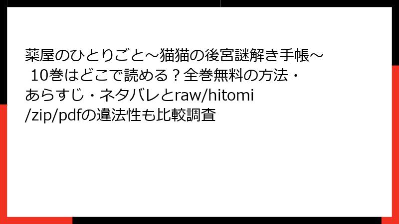 raw、hitomi、zip、pdf、漫画バンクなどの海賊版サイトで「薬屋のひとりごと~猫猫の後宮謎解き手帳~」を読むのは、法的・セキュリティ・倫理的なリスクが大きすぎます。無料の裏側に潜む危険を避け、正規の電子書籍サービスを利用しましょう。作品を支えることで、より良いコンテンツが生まれるはずです。