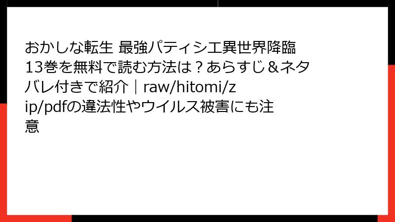 人気の異世界ファンタジー漫画「おかしな転生 最強パティシエ異世界降臨」を楽しむ方法として、正規のプラットフォームを利用するのがおすすめですが、一部の人々がraw、hitomi、zip、pdf、漫画バンクなどの海賊版サイトに手を出すケースがあります。しかし、これらのサイトを利用することは多大なリスクを伴います。この記事では、そうした海賊版サイトで漫画を読むことの危険性を詳しく解説します。法的問題からセキュリティの脅威まで、幅広く取り上げますので、参考にしてください。